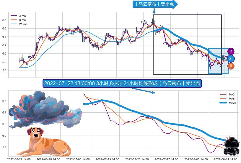⚀ 2022-07-05 14:00:00小时-2022-08-10 13:00:00小时显现 3小时-8小时-21小时均线 【乌云密布】卖出点 看空信号,后市看跌,卖出