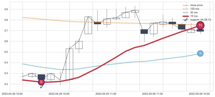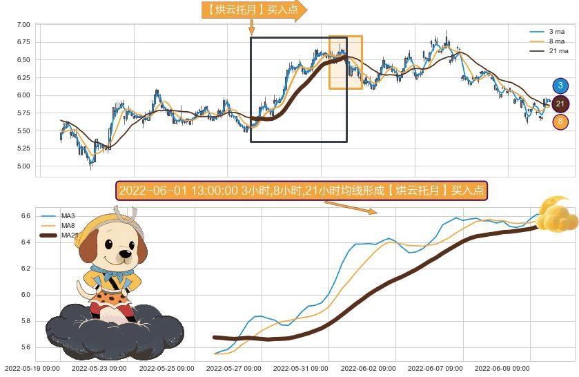 ⚀ 2022-05-25 13:00:00小时-2022-06-09 13:00:00小时显现 3小时-8小时-21小时均线 【烘云托月】买入点 看多信号,后市看涨,买入