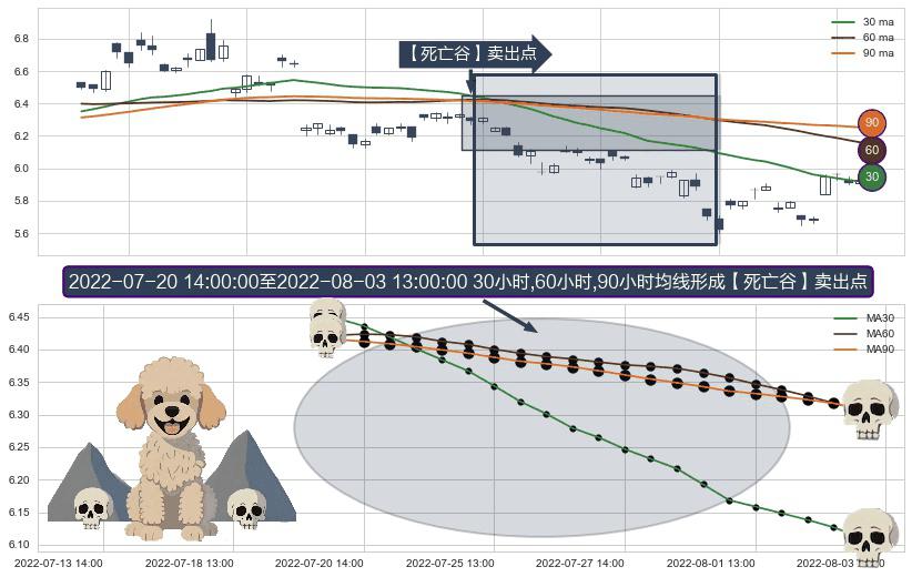 ⚀ 2022-07-21 13:00:00-小时至2022-08-03 13:00:00-小时显现 30小时-60小时-90小时均线 【死亡谷】卖出点 看空信号,后市看跌,卖出