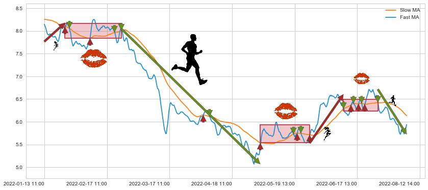 06-13 10:00至07-11 14:00 慢线与快线多次接触,存在上下穿越,有缠绕