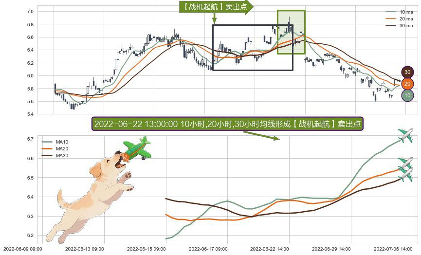 ⚀ 2022-06-15 09:00:00小时-2022-07-05 14:00:00小时显现 10小时-20小时-30小时均线 【战机起航】卖出点 看空信号,后市看跌,卖出