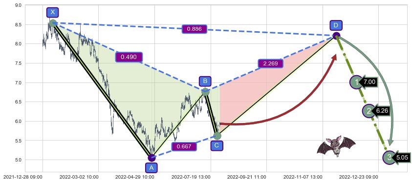 ➣ 未完成【蝙蝠】形态起点X: 01-07:10, 已到达C点: 08-03:14, 预测最终D点: 11-17:14, 共1012交易小时