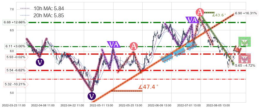♘ 支撑价格位5.32,可信任强度52.98%,距离最后交易2022-08-12 14:00形成的收盘价格5.93相差 -10.21%