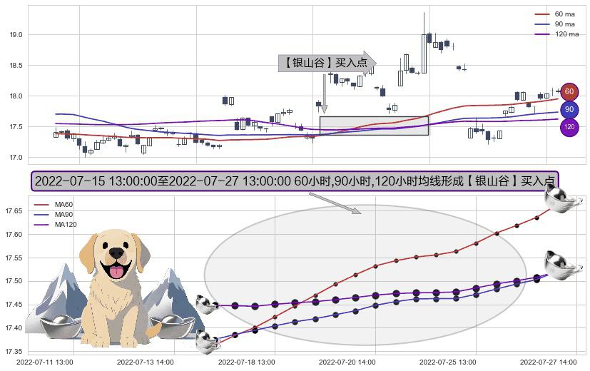 ⚀ 2022-07-15 14:00:00-小时至2022-07-27 13:00:00-小时显现 60小时-90小时-120小时均线 【银山谷】买入点 看多信号,后市看涨,买入