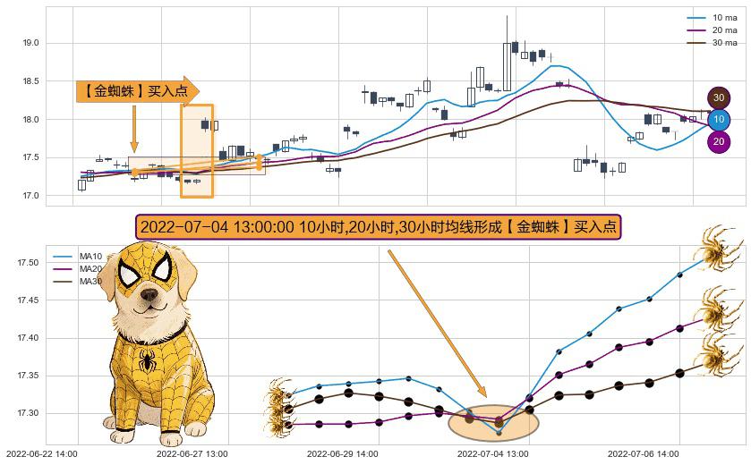 ⚀ 2022-07-04 13:00:00小时显现 10小时-20小时-30小时均线 【金蜘蛛】买入点 看多信号,后市看涨,买入