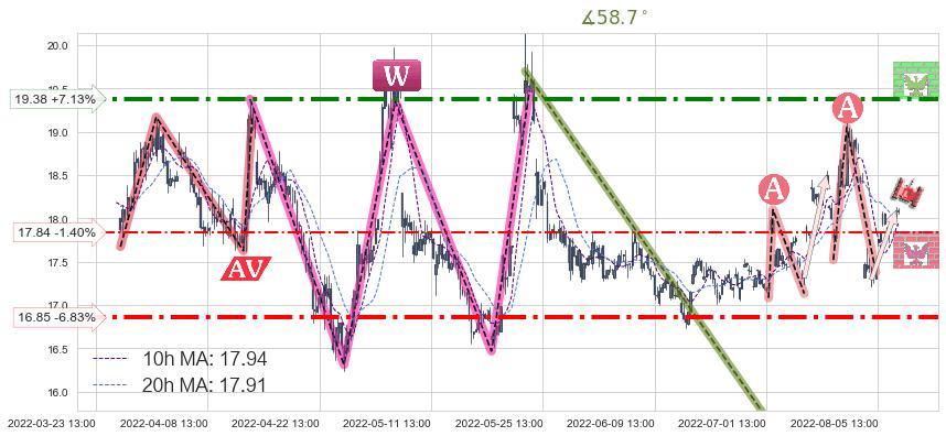 ♘ 阻力价格位19.38,可信任强度83.88%,距离最后交易2022-08-12 14:00形成的收盘价格18.09相差 +7.13%