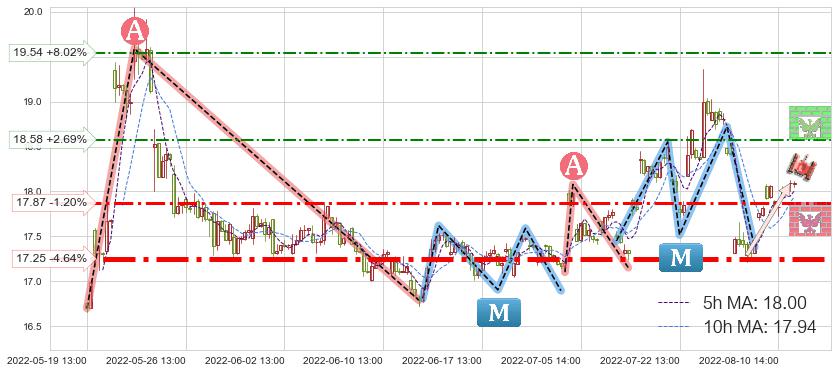 ♘ 阻力价格位19.54,可信任强度53.96%,距离最后交易2022-08-12 14:00形成的收盘价格18.09相差 +8.02%