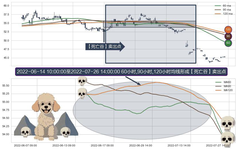 形态多维评估: ⚀ 2022-06-14 11:00:00-小时至2022-07-26 14:00:00-小时显现 60小时-90小时-120小时均线 【死亡谷】卖出点 看空信号,后市看跌,卖出