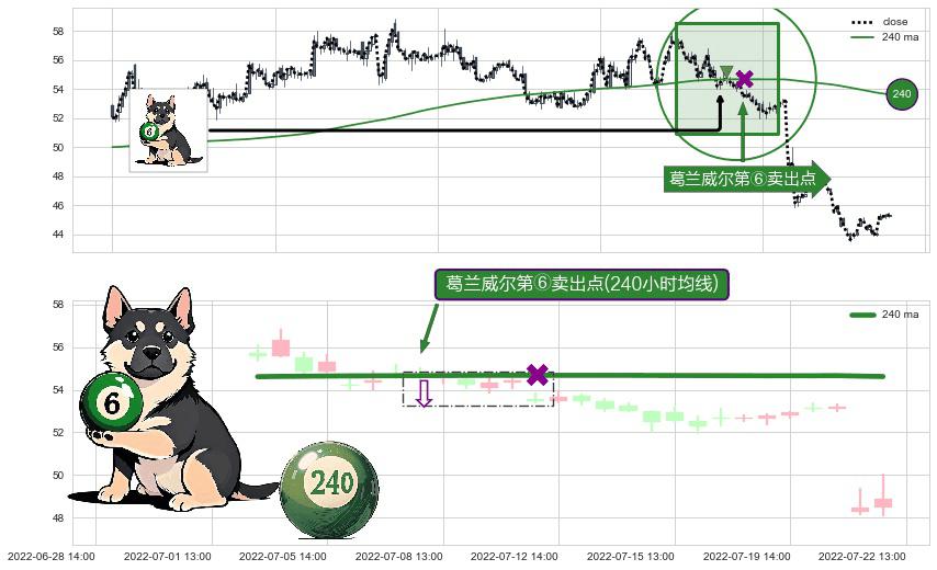 形态多维评估: ⚀ 2022-07-07 14:00:00-小时显现 葛兰威尔均线 240小时均线 第⑥卖出点 走势反转见顶信号,后市看跌,卖出信号