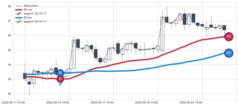 上涨趋势05-11 14:00-05-24 14:00,均线60, 30确认关键支撑1处