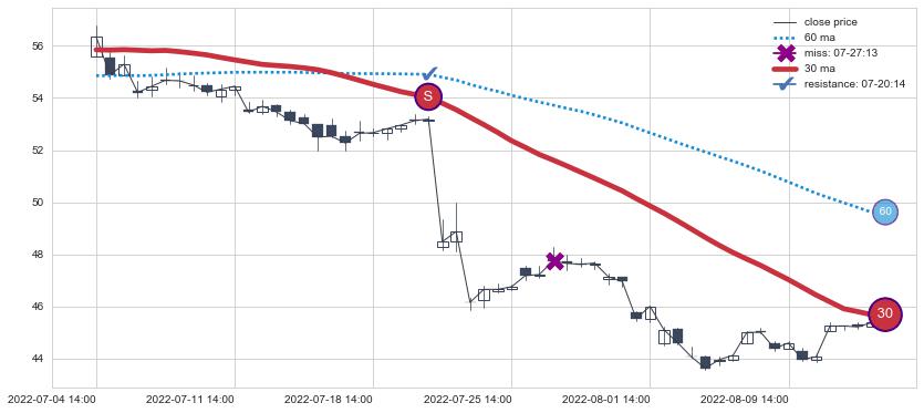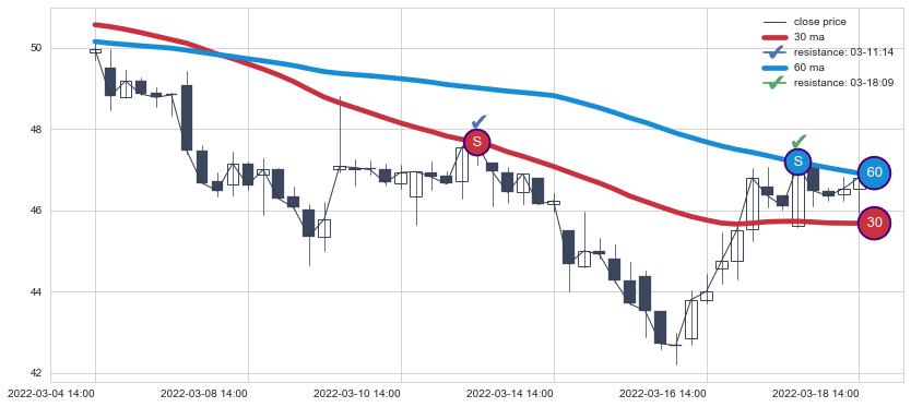 下跌趋势03-04 14:00-03-18 14:00,均线60, 30确认关键阻力2处