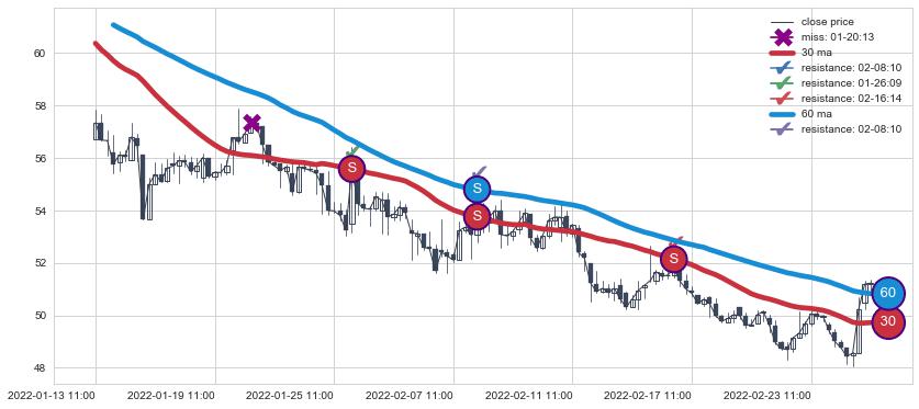 下跌趋势01-13 11:00-02-25 11:00,均线60, 30确认关键阻力3处