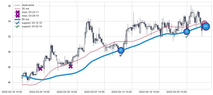 上涨趋势03-18 14:00-04-28 09:00,均线60确认关键支撑2处