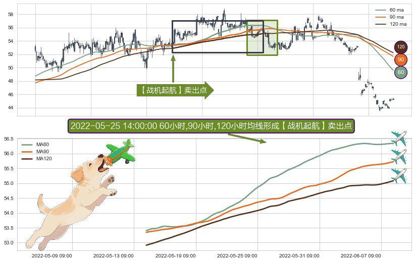 形态多维评估: ⚀ 2022-05-13 14:00:00小时-2022-06-07 14:00:00小时显现 60小时-90小时-120小时均线 【战机起航】卖出点 看空信号,后市看跌,卖出