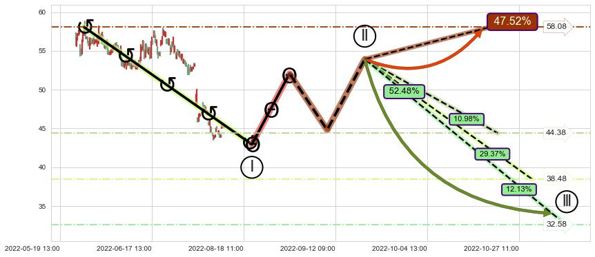 2022-06-20: 第一阻力位57.43强力阻拦了上升趋势,成功阻止了价格的继续上涨。