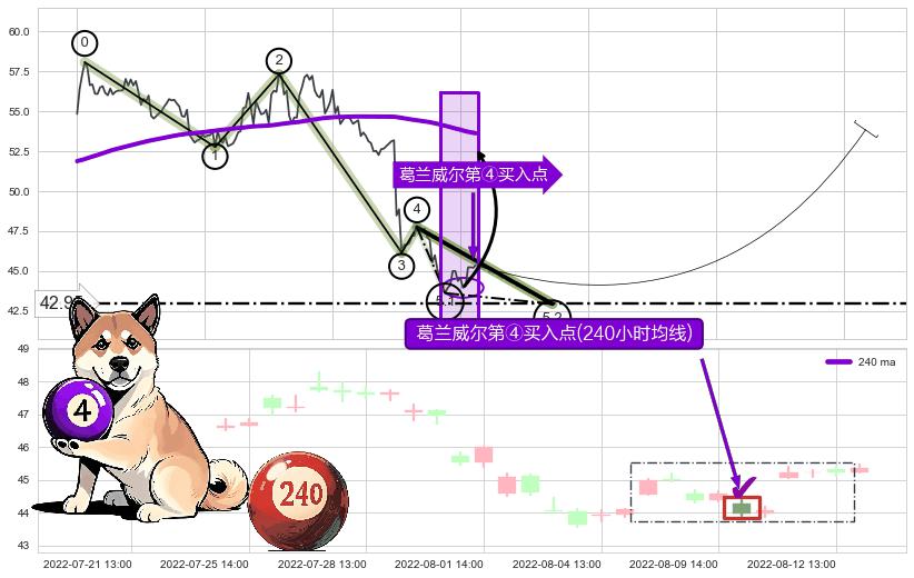 ➢ 5.1: 预测当前第5浪位置(08-03:14, 43.62),仍然有下跌空间