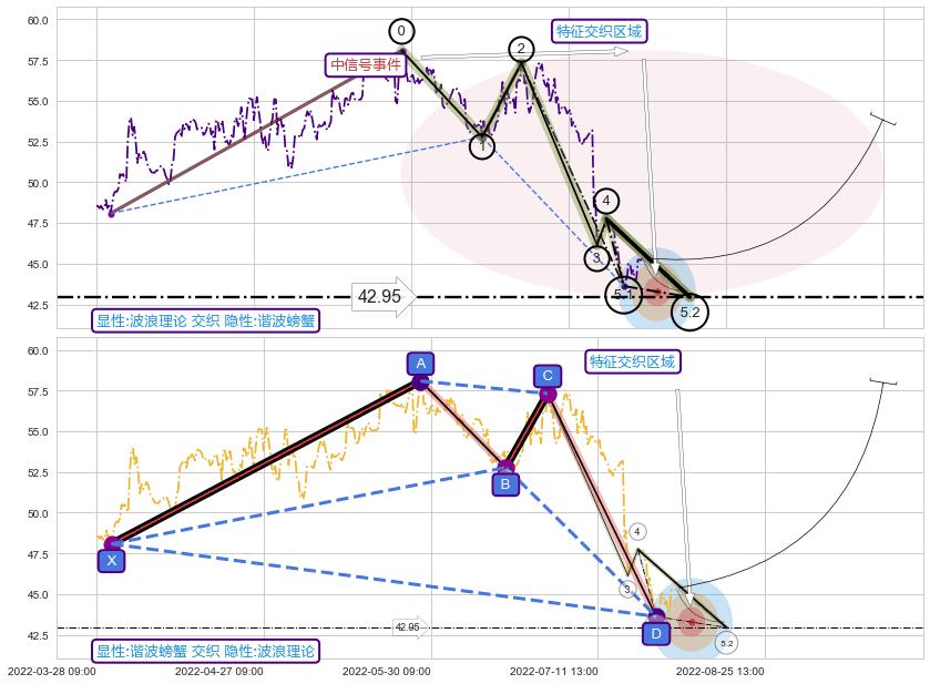 从2022-07-01 13:00至2022-08-12 14:00,共包含60个小时,阶段股价下跌-18.13%,阶段股价变动位移路程比: 1 : 3,2022-07-21 13:00向↘︎形成缺口,跳空下跌-8.86%˚