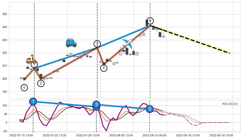 ➢ 第一, 三驱动浪端点:【KDJ】走势出现【常规背离 & 反转信号】背离程度48.06%,背离夹角角度55.6˚,背离程度中等