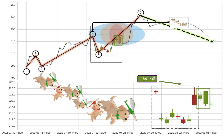 从2022-07-04 13:00至2022-07-13 14:00,共包含16个小时,阶段股价下跌-5.70%,阶段股价变动位移路程比: 1 : 2