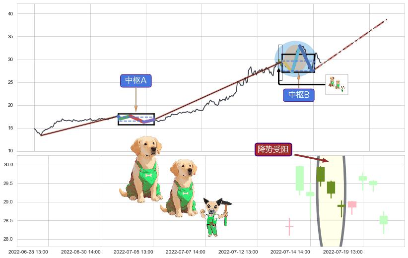➣ 【中枢B】:07-19:13-08-05:14,中枢由4笔构成,共27交易小时, ZG=29.57, ZD=27.40