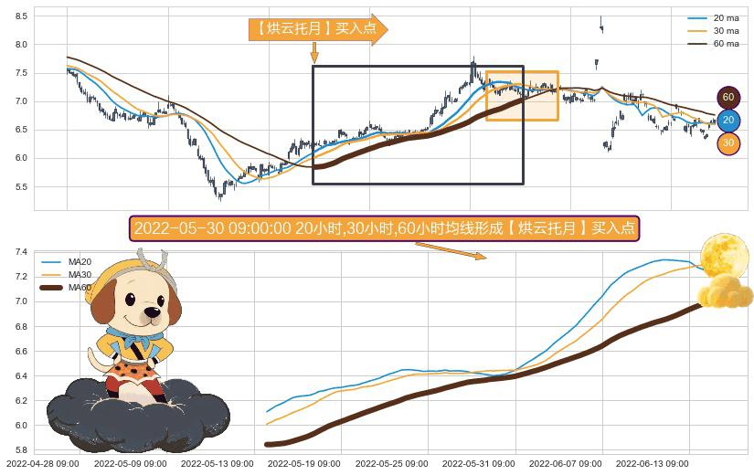 形态多维评估: ⚀ 2022-05-13 13:00:00小时-2022-06-14 10:00:00小时显现 20小时-30小时-60小时均线 【烘云托月】买入点 看多信号,后市看涨,买入