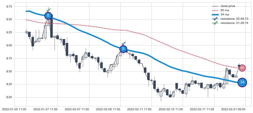 下跌趋势01-25 11:00-02-21 09:00,均线34确认关键阻力2处