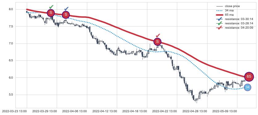 下跌趋势03-23 13:00-05-10 13:00,均线65确认关键阻力3处