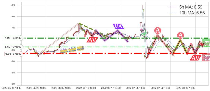 ♘ 阻力价格位6.65,可信任强度57.20%,距离最后交易2022-08-12 14:00形成的收盘价格6.60相差 +0.69%