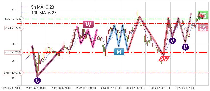 ♘ 阻力价格位6.30,可信任强度56.50%,距离最后交易2022-08-12 14:00形成的收盘价格6.29相差 +0.13%