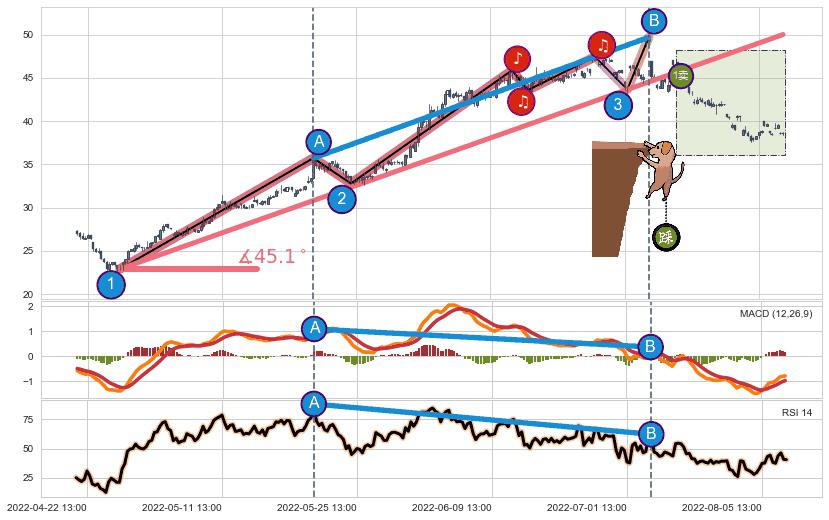 从2022-07-07 14:00至2022-08-12 14:00,共包含51个小时,阶段股价下跌-24.20%,阶段股价变动位移路程比: 1 : 2
