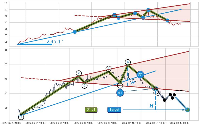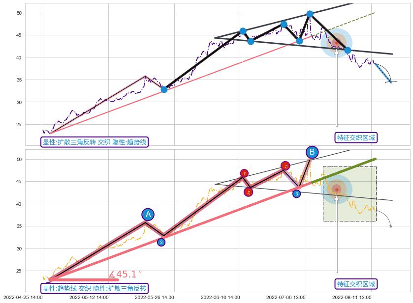| 4 🅚:顶部尽头线(下山虎) ➕ 📐:扩散三角反转下行突破支撑位破位, 猜想持续下沉下跌,被突破的支撑位已变为阻力位 ☞ 看空信号 ⇥ 【🅚线】交织【图形】⇥ 综合量化分数: 45 | > |