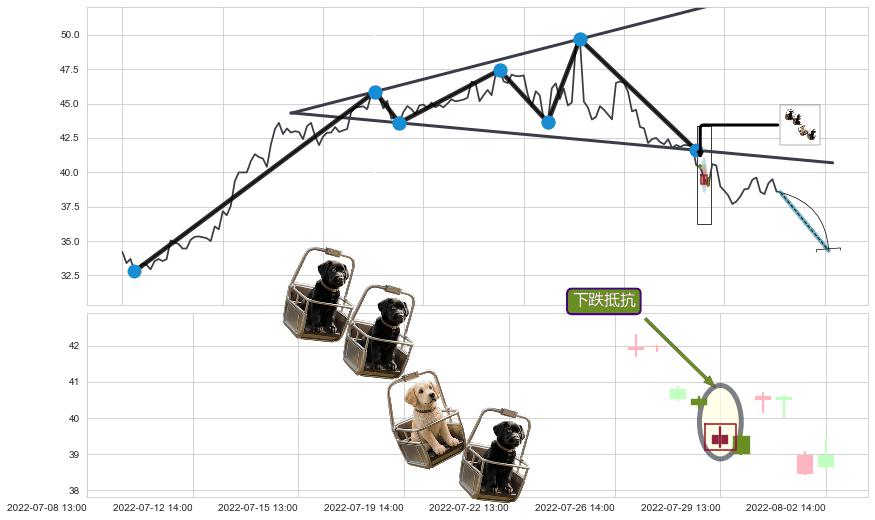 ➢ 最后的上涨趋势2022-04-27 09:00至2022-07-08 14:00:存在破位迹象,后续小调整或者反转下跌