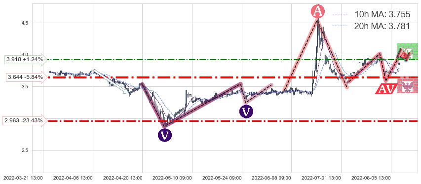♘ 阻力价格位3.918,可信任强度46.44%,距离最后交易2022-08-12 14:00形成的收盘价格3.870相差 +1.24%