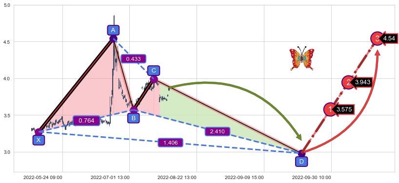 ➣ 未完成【蝴蝶】形态起点X: 05-13:09, 已到达C点: 07-27:13, 预测最终D点: 09-21:15, 共378交易小时