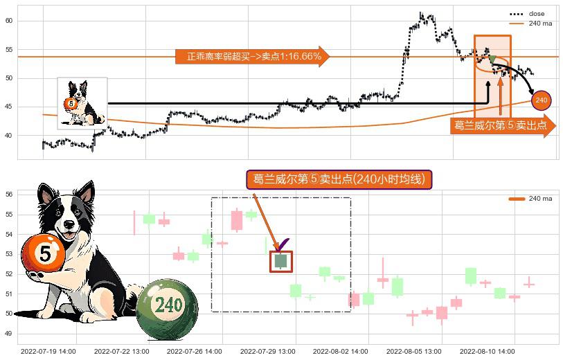⚀ 2022-07-28 14:00:00-小时显现 葛兰威尔均线 240小时均线 第⑤卖出点 上升趋势均值回复的短线回落信号,后市看跌,卖出信号