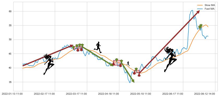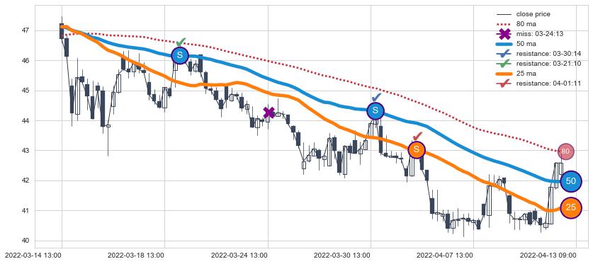 03-14 13:00至04-13 09:00 慢线与快线呈空头排列, 慢线与快线接触少,无缠绕