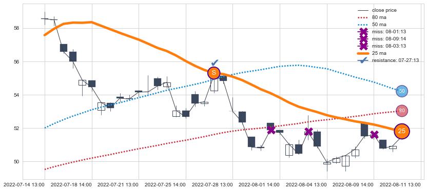 ⚃ 2022-07-28 14:00:00-小时 第⑤卖出点 距离均线【远】距离,均线主动修复向下牵引作用【弱】