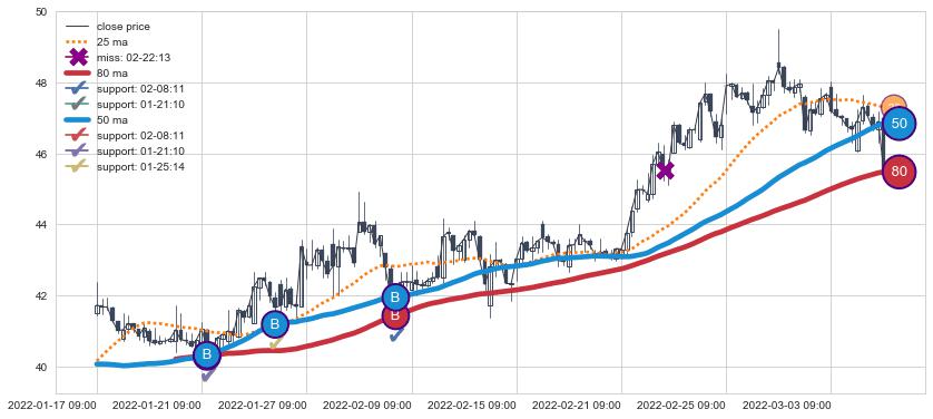 ⚅ 买点向上突破均线后,价格走势有持续向上的迹象,但动能稍显不足,迟迟不能远离均线