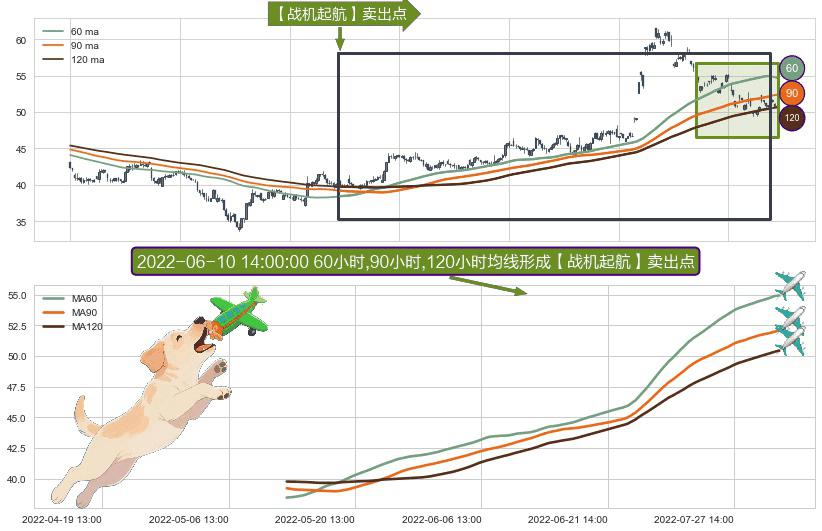 ⚀ 2022-05-13 10:00:00小时-2022-08-10 14:00:00小时显现 60小时-90小时-120小时均线 【战机起航】卖出点 看空信号,后市看跌,卖出