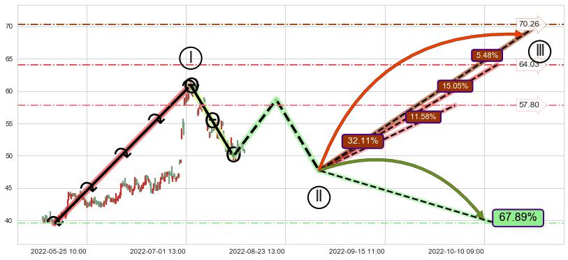 ➢ 循环浪继续向上【最低】位置(10-03:10, 57.80),匹配聚类样本比例36.07%, 可能性概率11.58%