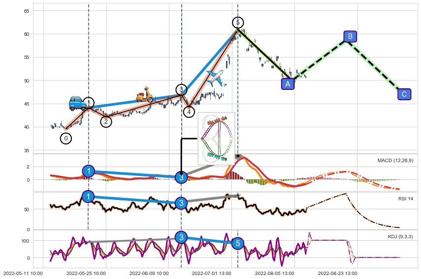 ➢ 1,3,5驱动浪MACD, RSI, KDJ走势都出现【常规背离】反转信号增强