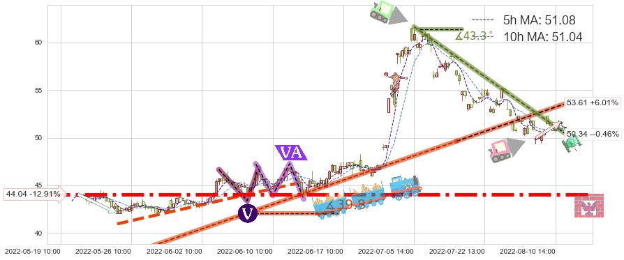 ⚔️ 2022-07-05 14:00-2022-08-11 13:00下跌趋势存在反转上涨[机会],虽然原下跌趋势的阻力位(50.34)已被突破,但其阻力效果尚存,原下跌趋势角度: 43.3˚