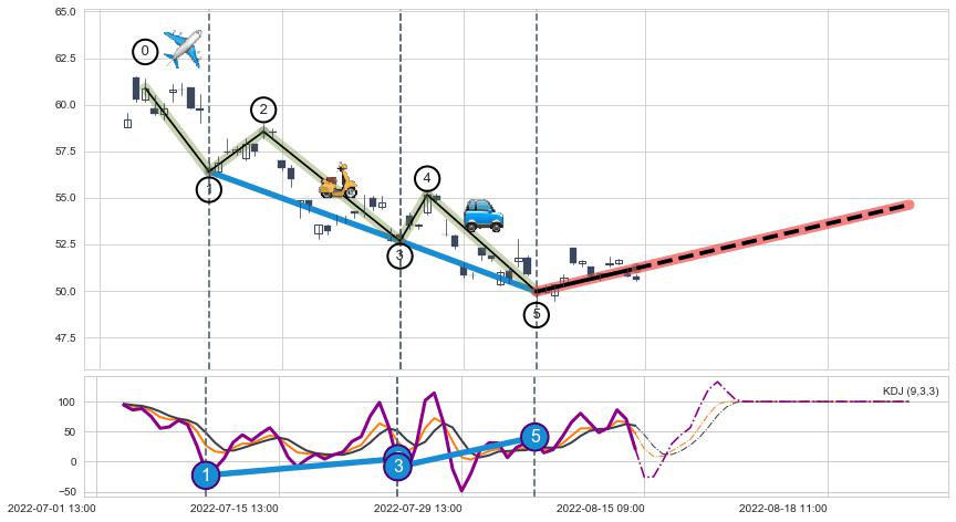 ➣ 第一, 三驱动浪端点:【KDJ】走势出现【常规背离 & 反转信号】背离程度36.31%,背离夹角角度58.9˚,背离程度较小