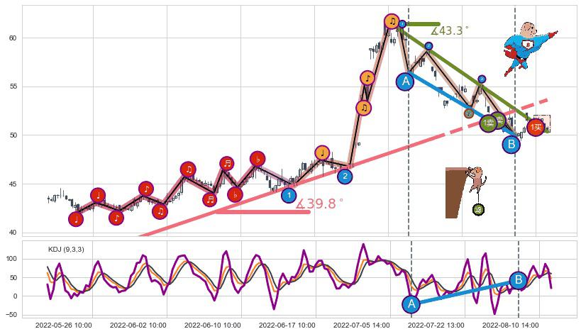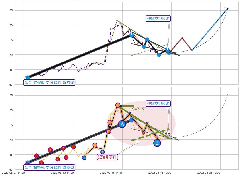从2022-07-05 14:00至2022-08-11 13:00,共包含52个小时,阶段股价下跌-16.04%,阶段股价变动位移路程比: 1 : 3,下跌趋势角度: 43.3