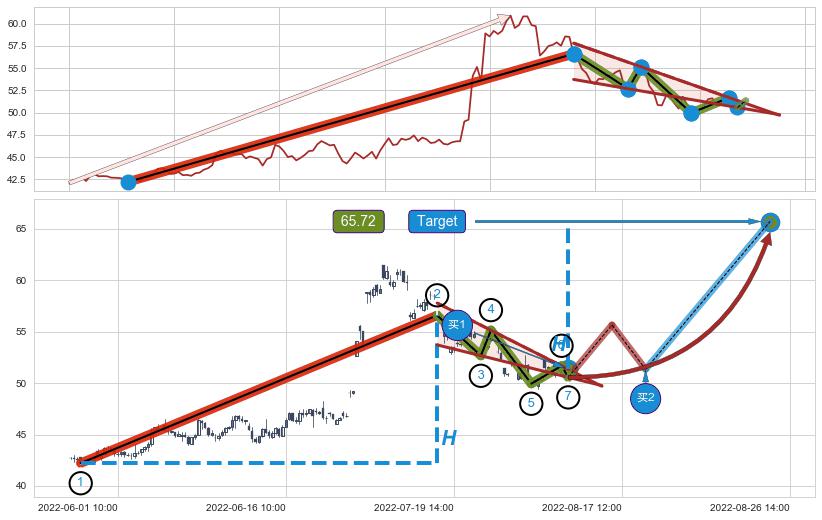 ➢ 最小中继整理涨幅→𝐇: 14.37 (𝐇楔型旗杆的长度:楔型起点→顶点)