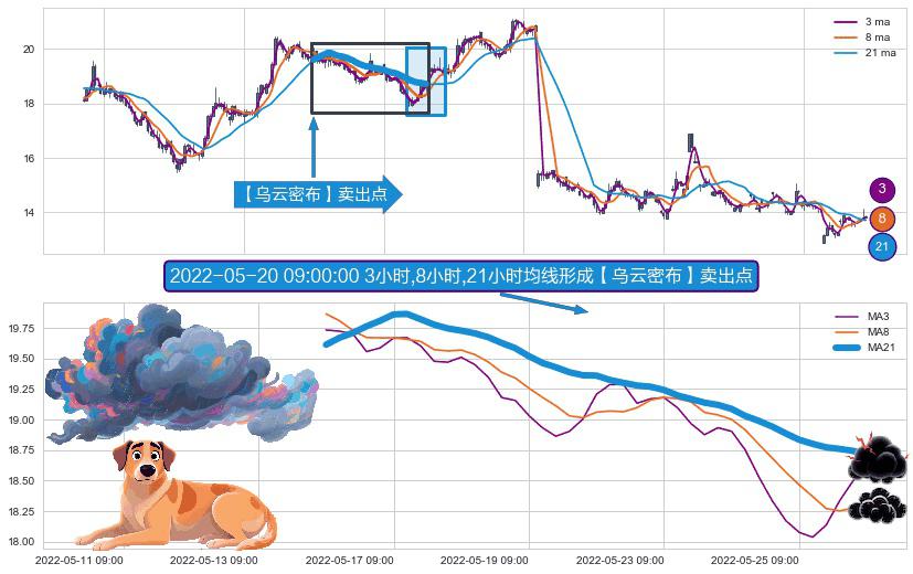 ⚀ 2022-05-16 09:00:00小时-2022-05-26 09:00:00小时显现 3小时-8小时-21小时均线 【乌云密布】卖出点 看空信号,后市看跌,卖出