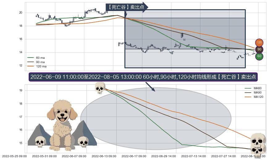 ⚀ 2022-06-09 13:00:00-小时至2022-08-05 13:00:00-小时显现 60小时-90小时-120小时均线 【死亡谷】卖出点 看空信号,后市看跌,卖出