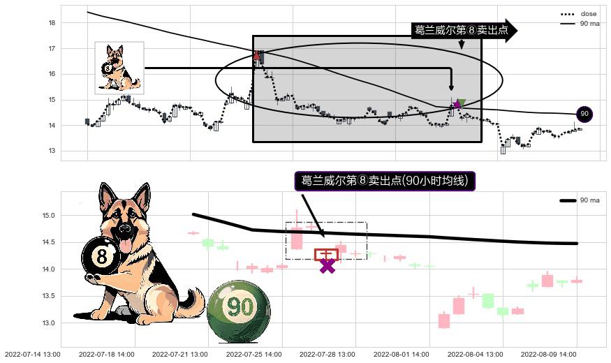 ⚀ 2022-07-27 13:00:00-小时显现 葛兰威尔均线 90小时均线 第⑧卖出点 下降趋势的中继信号,后市看跌,卖出信号