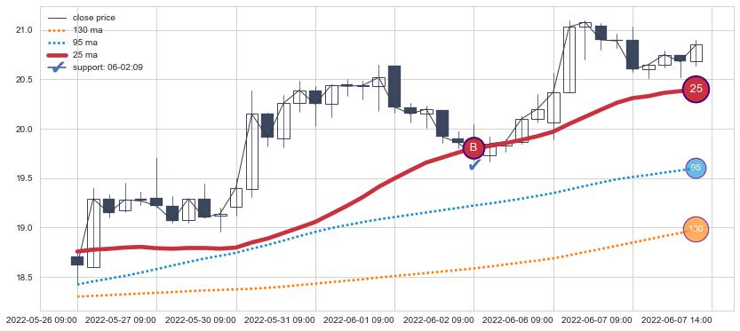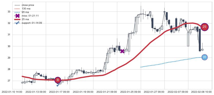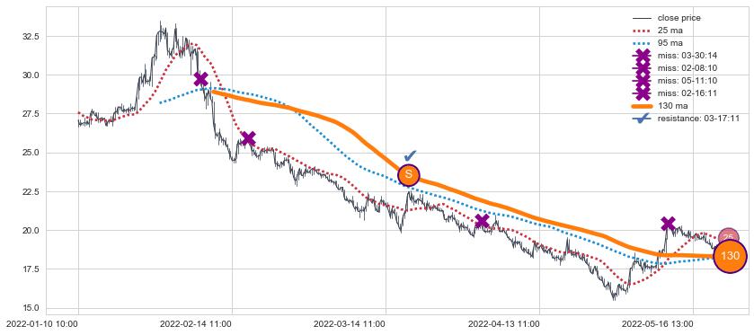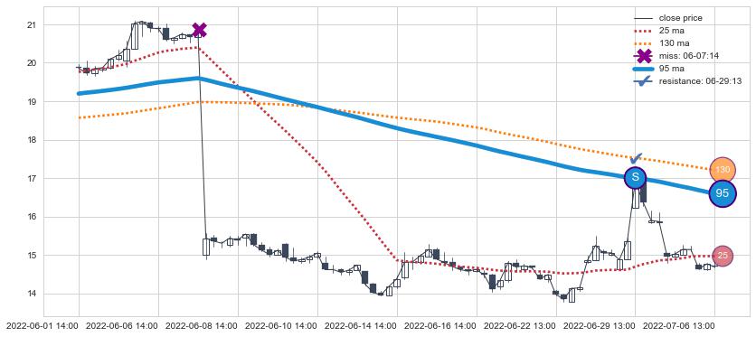 ⚂ 2022-06-29 13:00:00-小时均线向上突破,2022-07-27 13:00:00-小时重新下穿均线破位,均线阻力再次生效