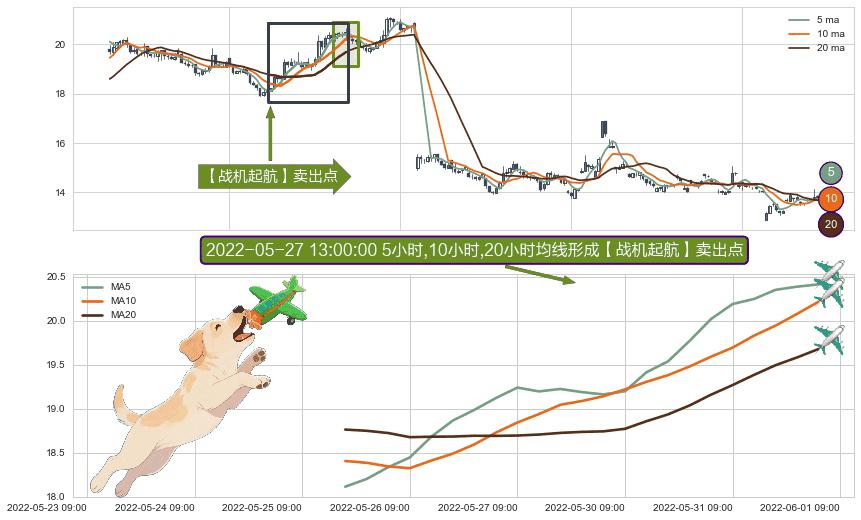 ⚀ 2022-05-25 11:00:00小时-2022-05-31 14:00:00小时显现 5小时-10小时-20小时均线 【战机起航】卖出点 看空信号,后市看跌,卖出